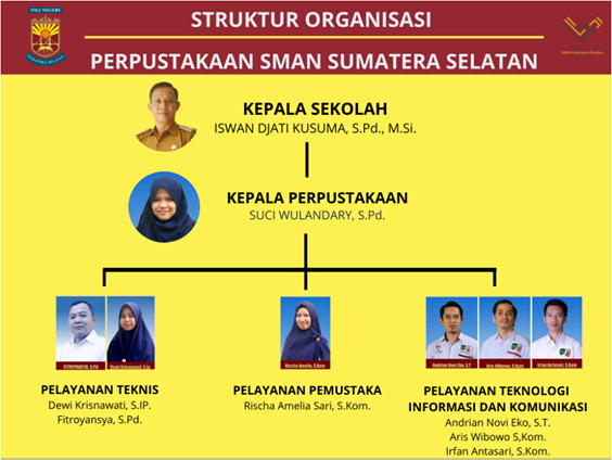 Sejak awal berdirinya hingga saat ini, Perpustakaan SMAN Sumatera Selatan dikelola oleh Rischa Amalia Sari S.Kom., sebagai pustakawanyang mengelola layanan pemustaka di perpustakaan SMAN Sumatera Selatan hingga sekarang dan pada layanan teknologi informasi dan komunikasi dikelola oleh Andrian Eko Susanto, S.T., Irfan Antasari Ridwan, S.Kom., Aris Wibowo, S.Kom., serta Fitroyansya, S.Pd. dan Dewi Krisnawati, S.IP., sebagai pustakawan yang mengelola layanan teknis di Perpustakaan SMAN Sumatera Selatan, selain itu perpustakaan telah mengalami beberapa pergantian kepala perpustakaan, yaitu: